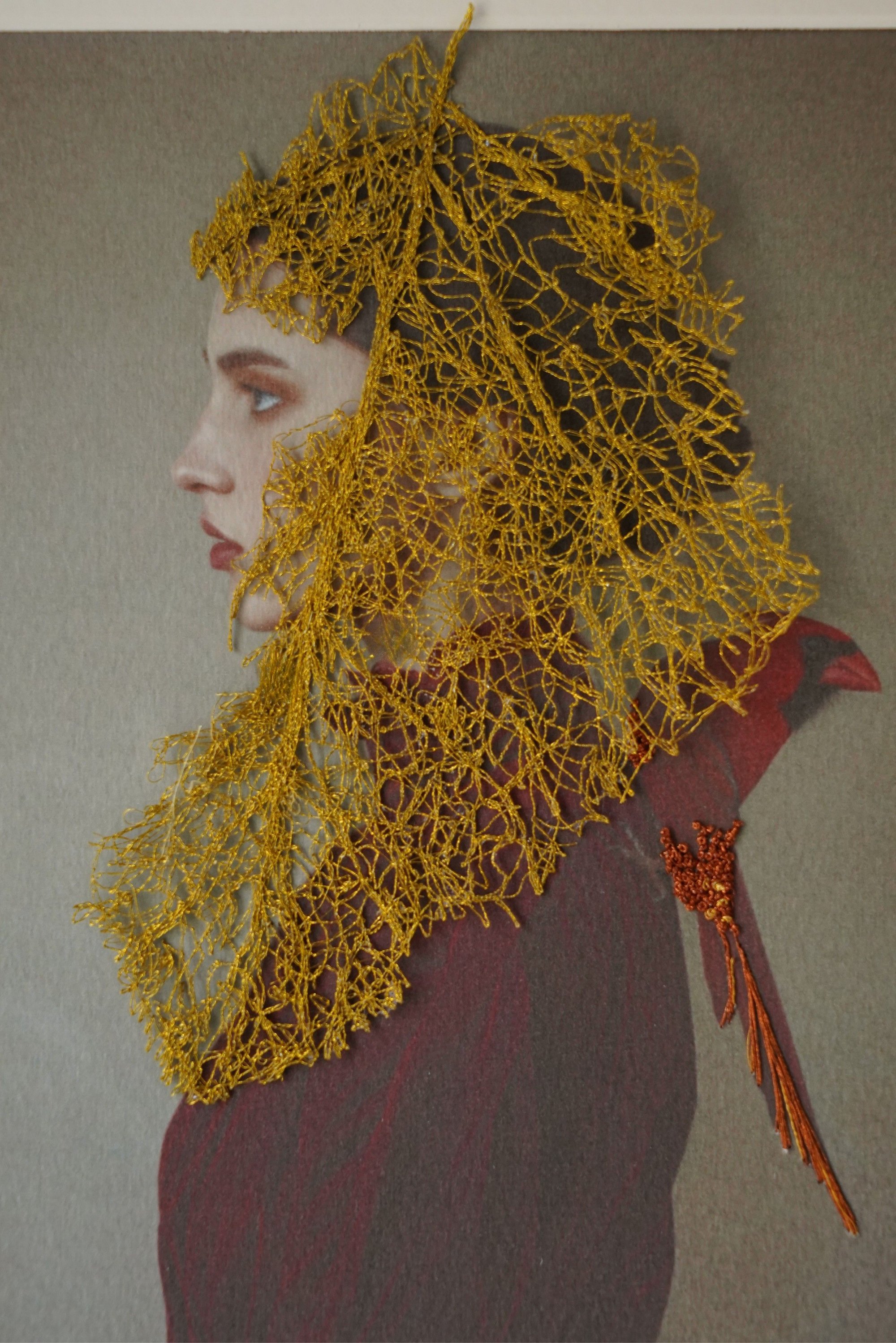 En recouvrant le visage d’un tissage végétal, Marcilly évoque un rituel intérieur : la peau devient mémoire, l’or devient lumière, et l’oiseau symbolise l’âme en mouvement.
