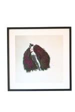 Les formes brodées, d’un vert profond ponctué de fleurs fuchsia, évoquent à la fois la luxuriance et la fragilité du vivant.