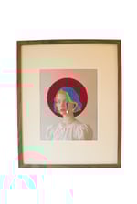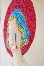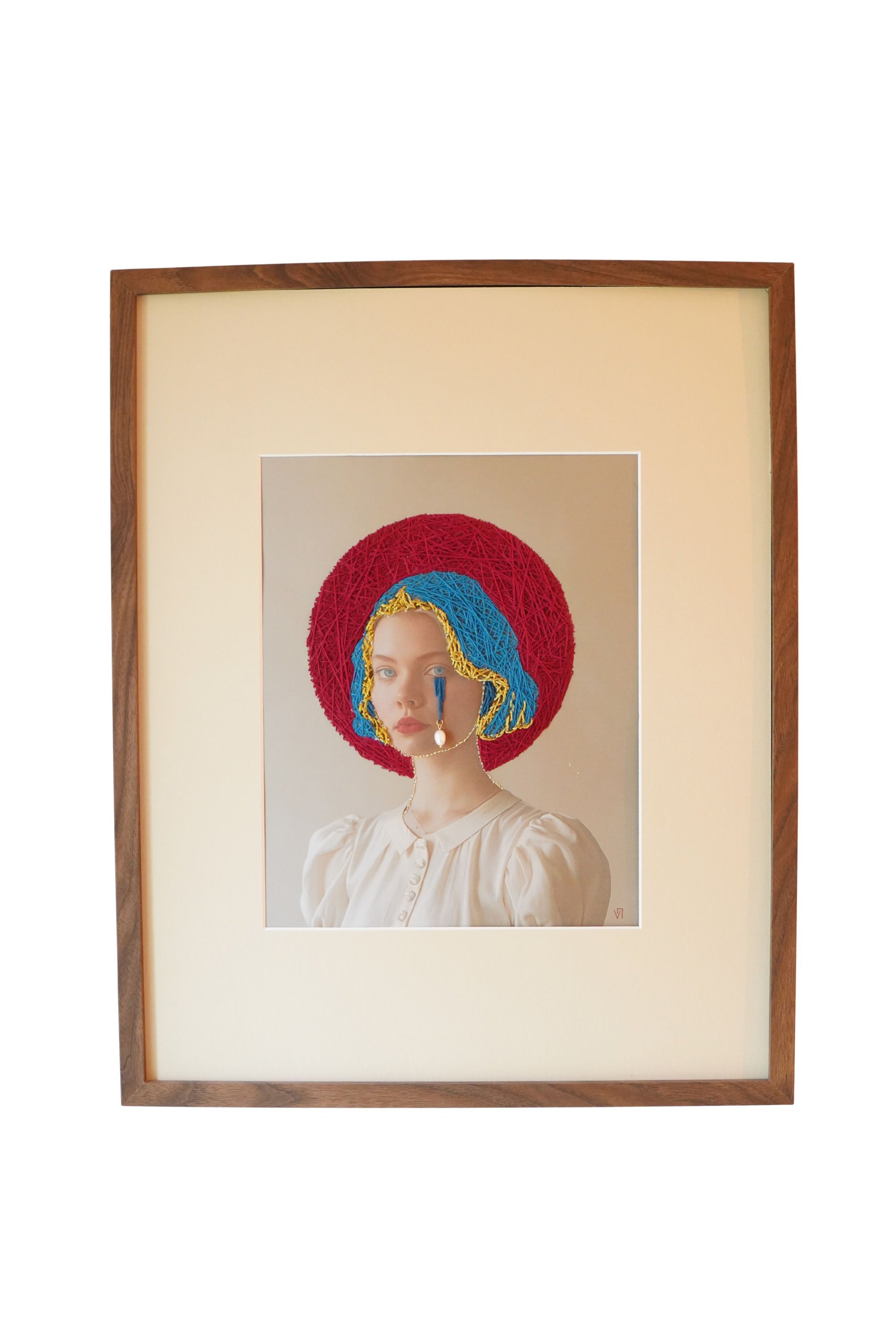 Je voulais créer une aura de fils colorés pour encadrer le visage de la jeune femme, évoquant ainsi un halo sacré et rappelant des icônes religieuses revisitées.